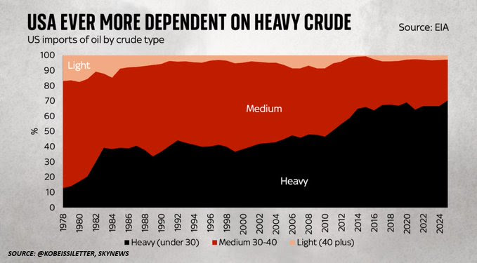 This matters because the U.S. has quietly become highly dependent on heavy crude. In the 1980s, only about 10–20% of U.S. crude imports were heavy oil. Today, that figure is closer to 70%. At the same time, Texas and Louisiana host some of the largest heavy-crude refineries in the world, specifically designed to process this type of oil.